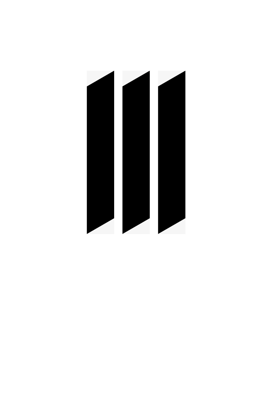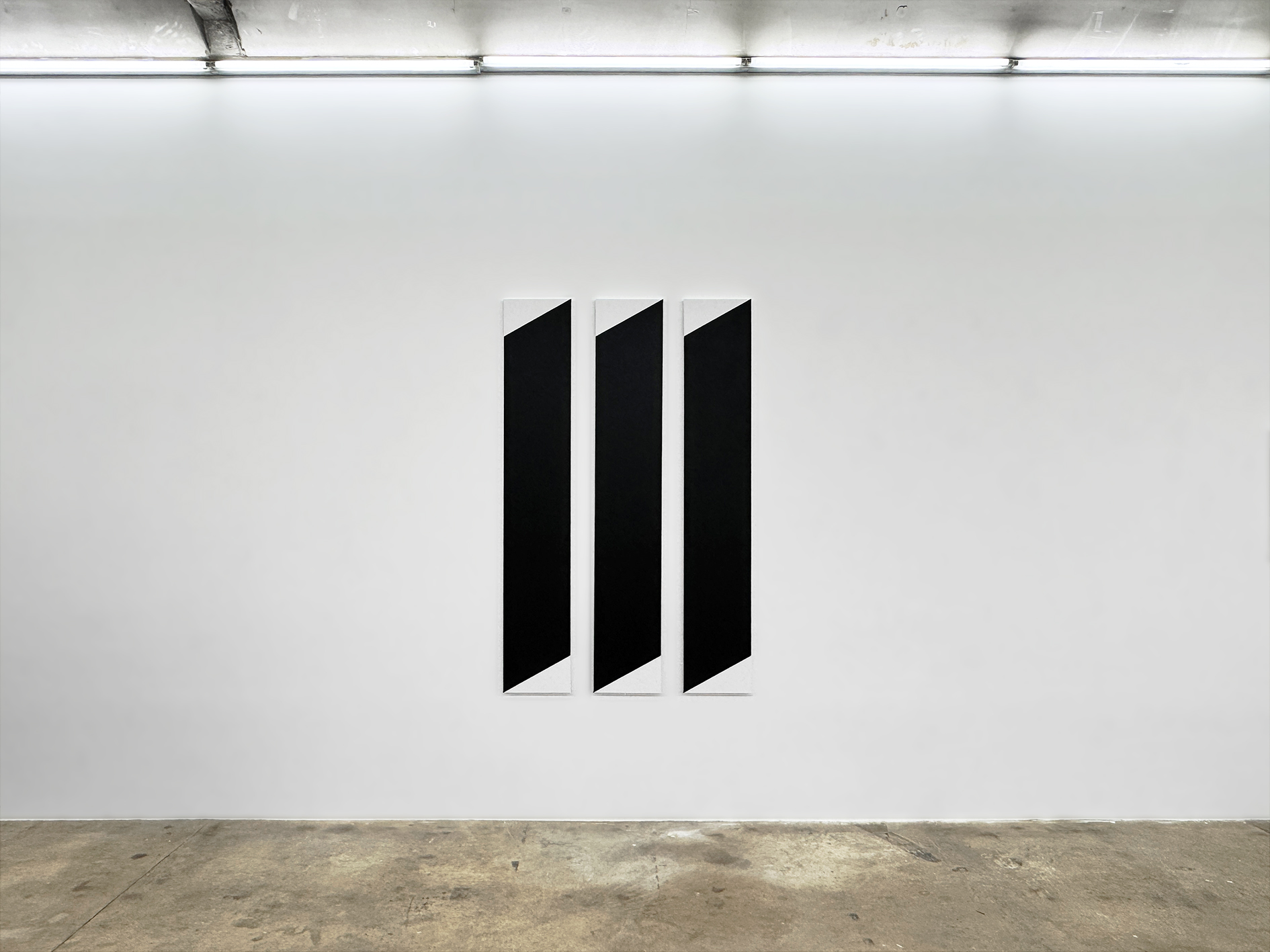 This triptych features three identical vertical panels, each displaying a thick black diagonal band that stretches between two white triangular corners.