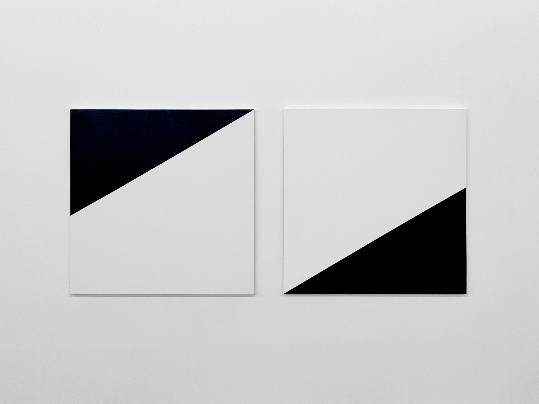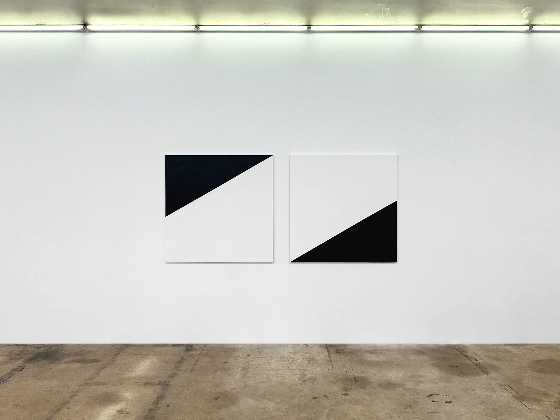 This diptych consists of two square canvases, each featuring a sharp diagonal division between solid black and stark white sections.